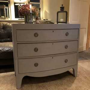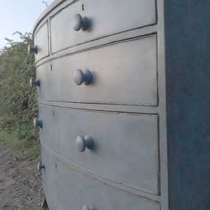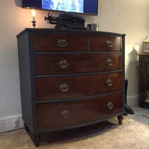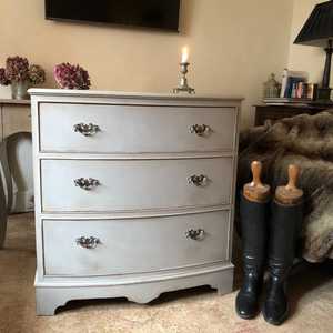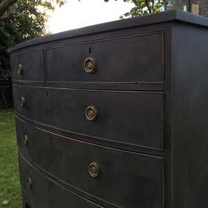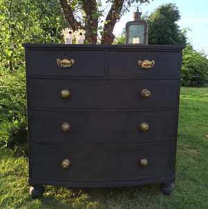 I had lots of fun refurbishing this beautiful bow fronted chest of drawers. I hand painted it in Annie Sloan's Graphite, a gorgeous black colour with grey/dark blue undertones.