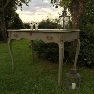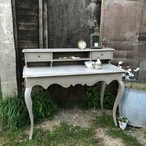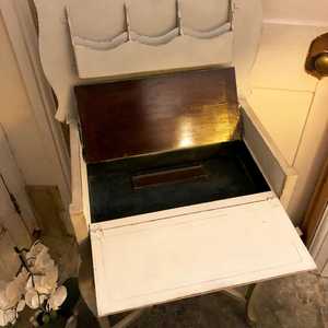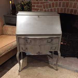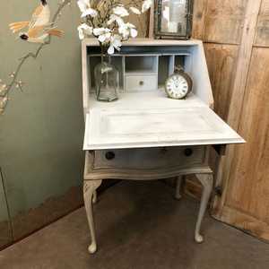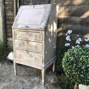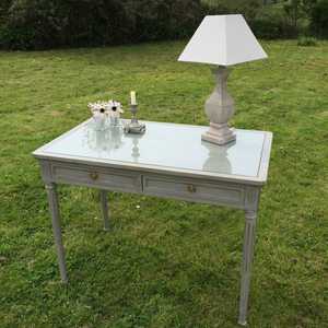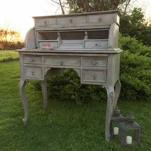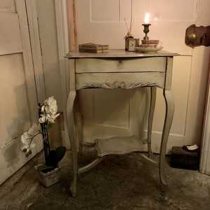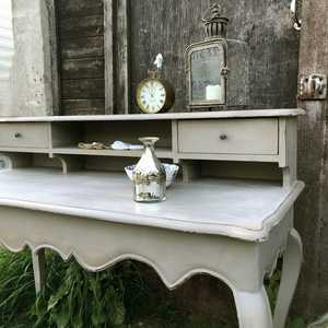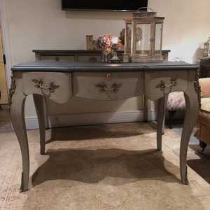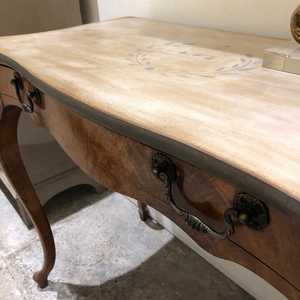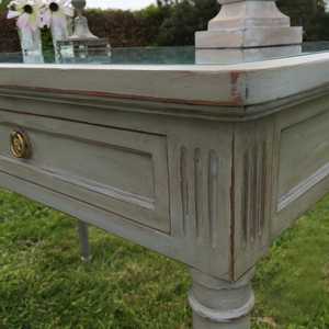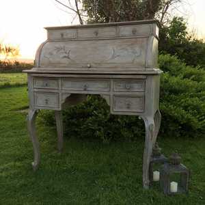 Found this unloved, bland looking writing desk. It had a glass top, which I did not like very much and when I unloaded it I was really wondering what I had done buying this piece. I could see that there was some potential and when I had painted it with Annie Sloan's Paris Grey and started the "aging" process (the fun part of my job), I could see that something beautiful was starting to come out of this darling desk and the awkward glass top actually enhanced the character of the desk. This sad looking desk had now turned into an elegant, romantic and rather unusual writing desk!