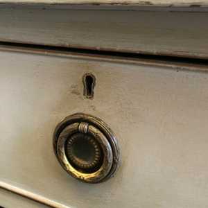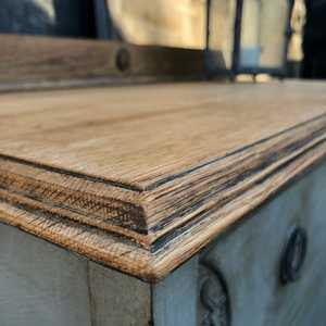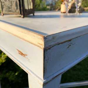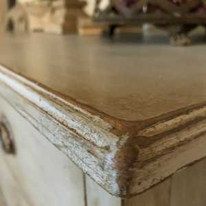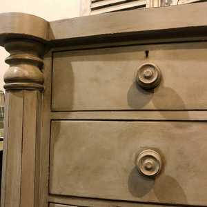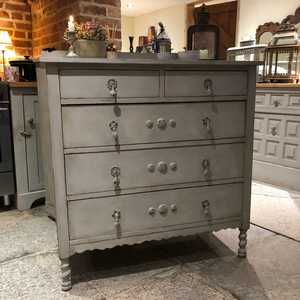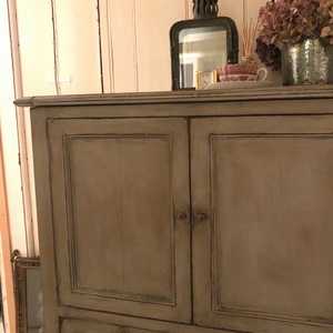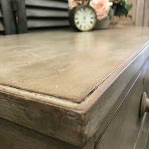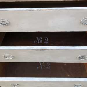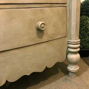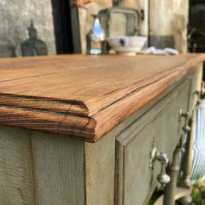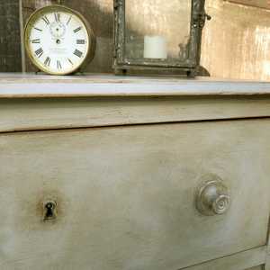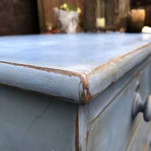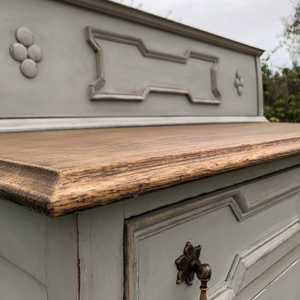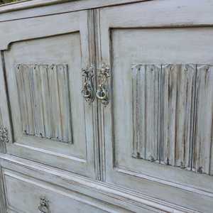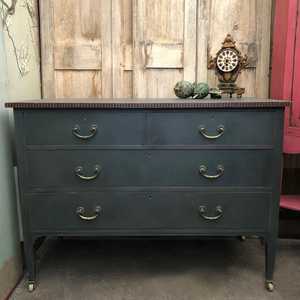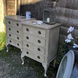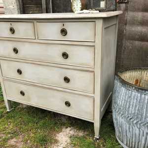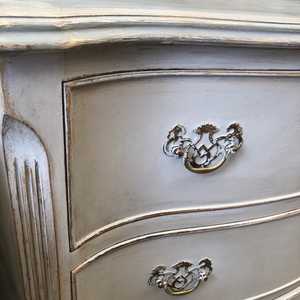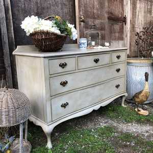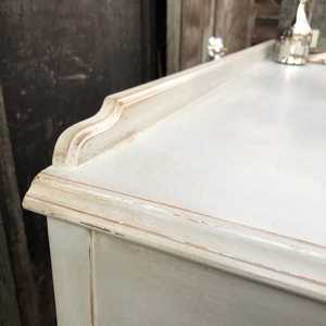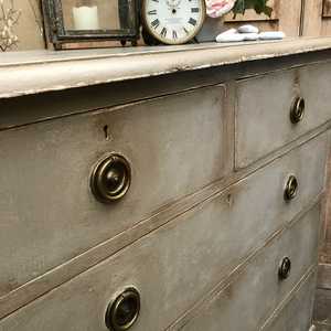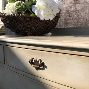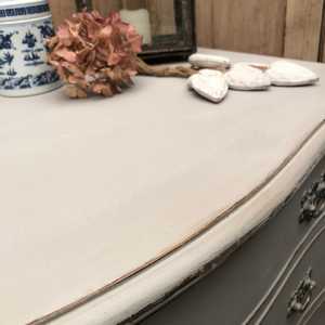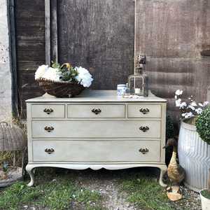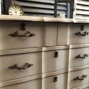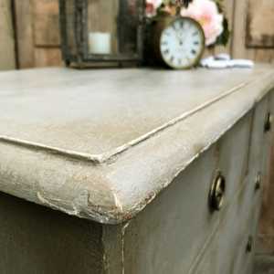 This grey hand painted and age distressed chest of drawers is just absolutely gorgeous. With its long width it will provide a lot storage, while being a focal point in your bedroom, dressing room, hallway, and even as a sideboard in your dining room. Use it as a TV stand in your living room or make it into a stunning double basin base for your bathroom!