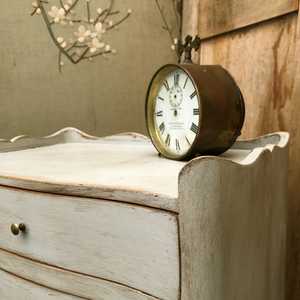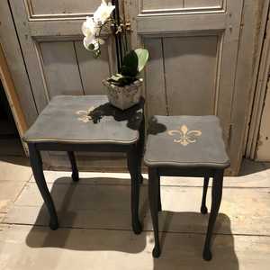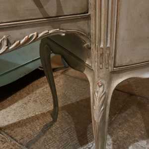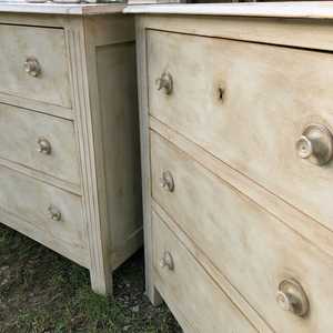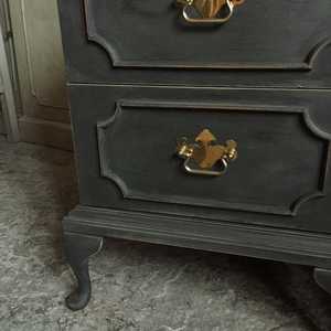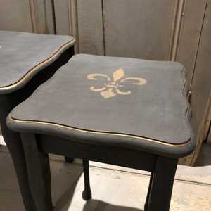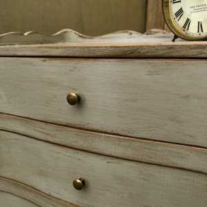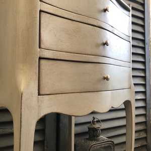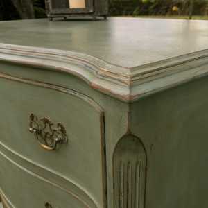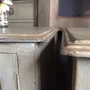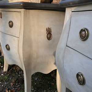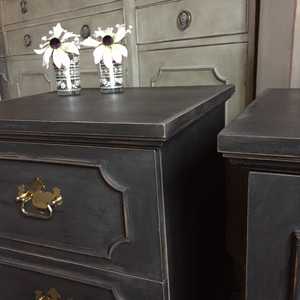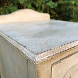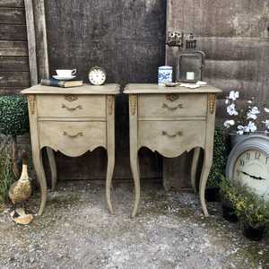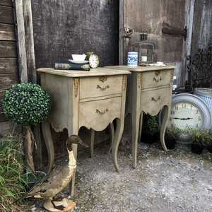 Adding ageing to the furniture can make quite a big difference. I often wait to decide how to age distress each piece until the last minute, as I let the furniture "speak" to me on what to do. No distressing, a little bit of character distressing or total age distressing. As you can see from the photos below, this matching set of French bedside tables just needed that little extra to truly expose the beautiful shape and details.