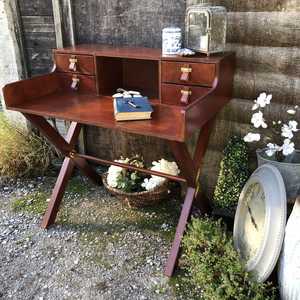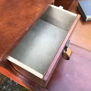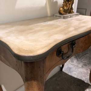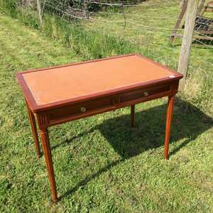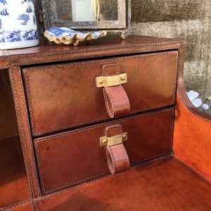 This stunning leather-clad writing desk is just to die for! If I could I would keep it, but if I did that with every piece that I love, then I would not have much stock in my shop! This desk has suede lined drawers and beautiful brass details. This gorgeous piece would be just as perfect in a contemporary show house style of decor as in an English cottage.