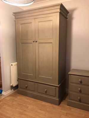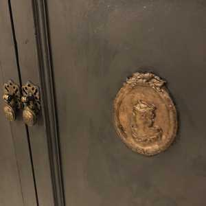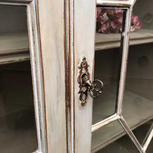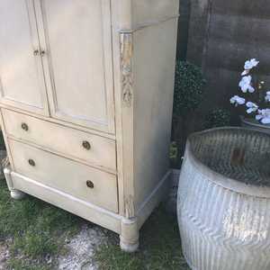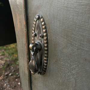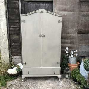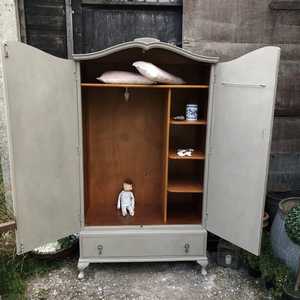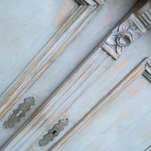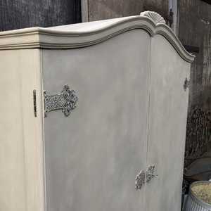 This grey hand painted armoire is just wonderful. It is big and yet small. Perfect for a cottage as well as a manor house! Use it as a wardrobe or why not take the sliding clothes rack out, add a few shelves and make it into fabulous cabinet for your kitchen, dining room, living room or study!