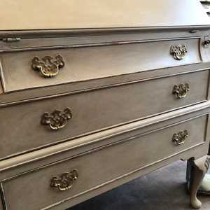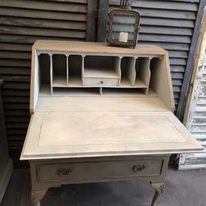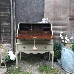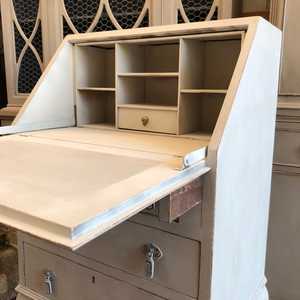 I could see the potential in this gem of a bureau when I found it and once finished I knew that I was right! I love it! I decided to paint it in Annie Sloan's Paris Grey and age distress the exterior, while leaving the beautiful mahogany interior untouched. Painting it has enhanced the gorgeous details and shape. With the key tassel added it is simply adorable.