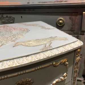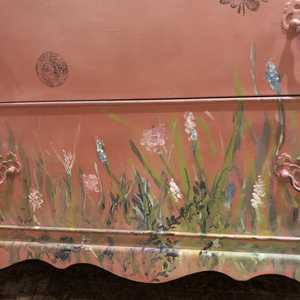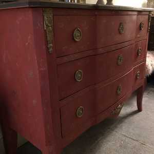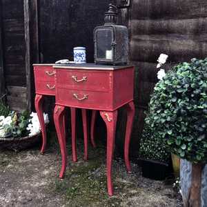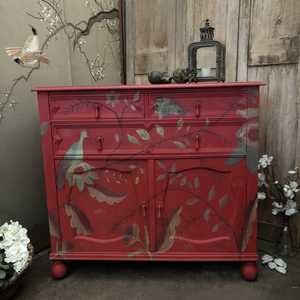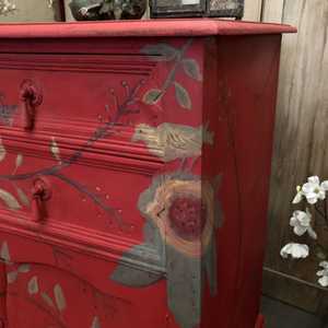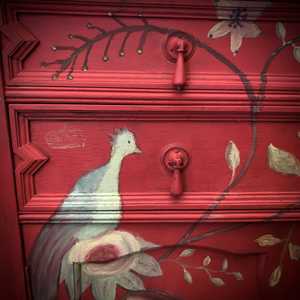 I was watching a clip on youtube about a facinating find in a 17th Century shipswreck. A beautiful red dress adorned with gold thread had survived in its coffer. I loved the colours and the worn pattern and decided to replicate this on an ornate French style chest of drawers and matching bedside tables. I love the stunning result and the vibrant colour! What do you think?
