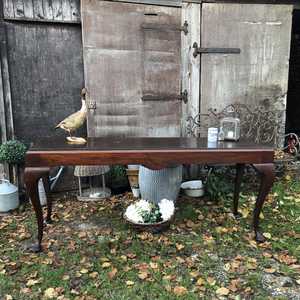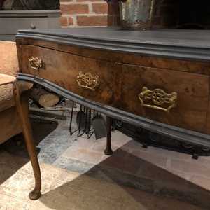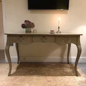 This absolutely gorgeous cabriole leg console table / writing desk has three front drawers decorated with beautiful brass drop handles and a matching fake set of drawers at the rear. Perfect behind a sofa that is placed in the middle of the room.