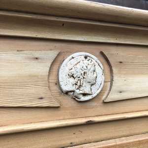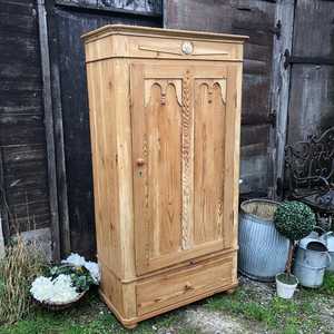 This gorgeous Swedish Gustavian Country style rustic old pine wardrobe / cupboard is an unique find with its beautiul details and the unusual lady medallion. Use it as a wardrobe or as characterful cupboard in your kitchen.