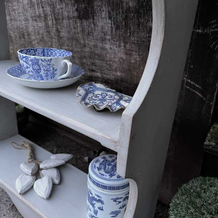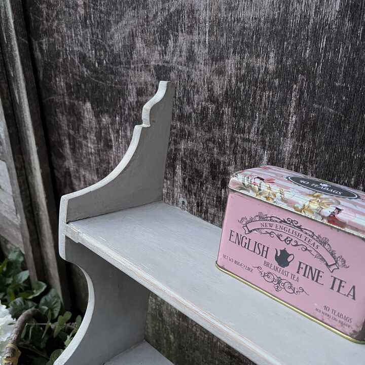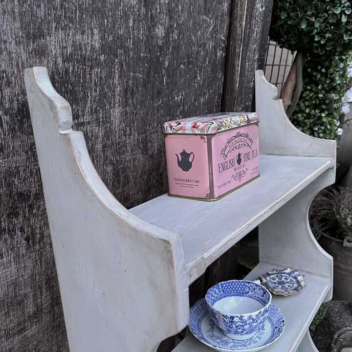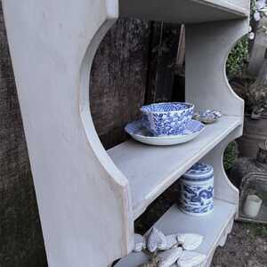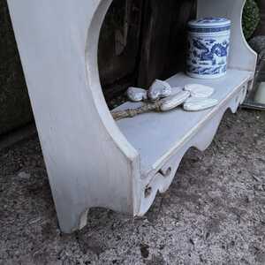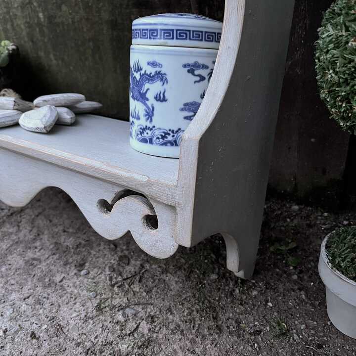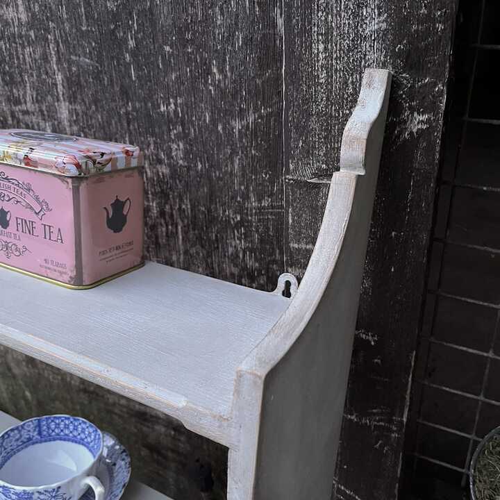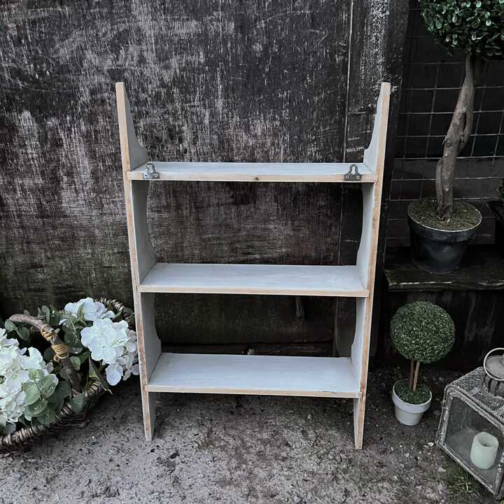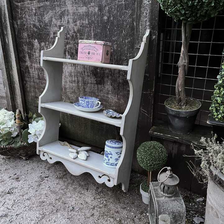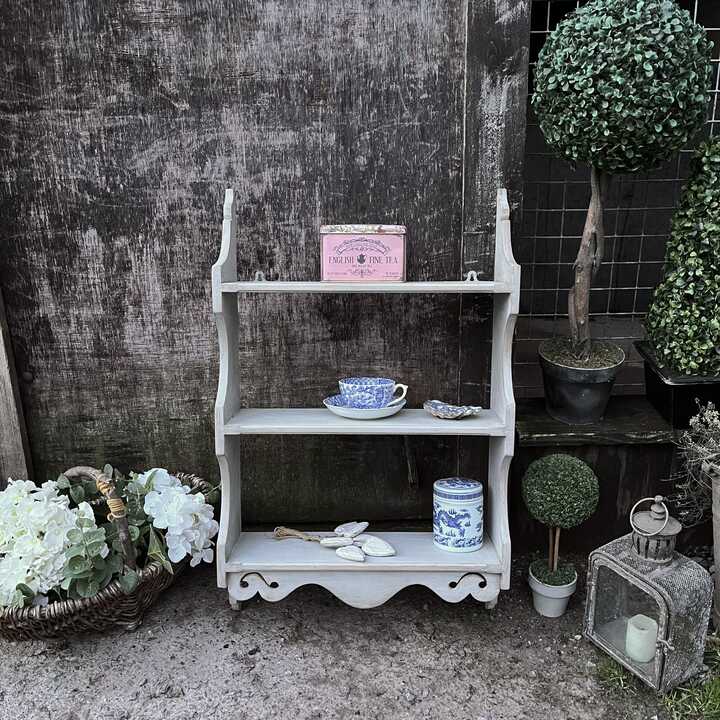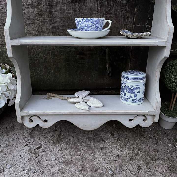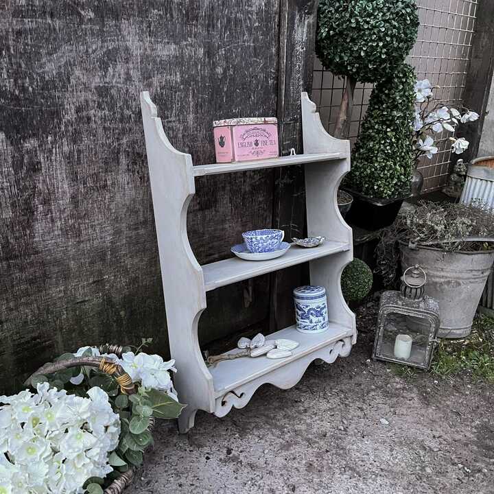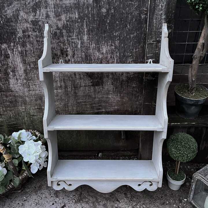 A wall shelf unit like this adds a lovely Country charm to your home. It has been painted in a rustic vintage style. There are three shelves over a decorative rim at the bottom part. It is a shelf unit for lighter items. Two brackets attached to the top shelf, makes hanging easy.