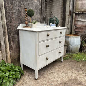The style of this chest of drawers offers that gorgeous combination of romantic and rustic Country style with its pretty back plate. It stands proud on raised ending in original functioning casters and has three spacious drawers with the original antiqued handles. This piece is perfect as a chest of drawers / bedside table in your bedroom or as a storage side table in your living room / hallway. It is probably from the 1950s.