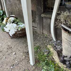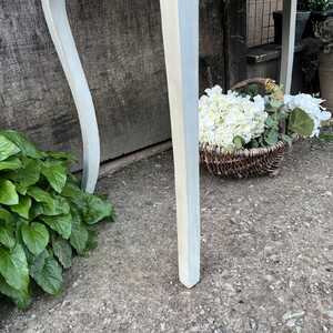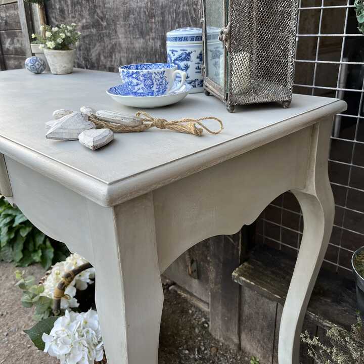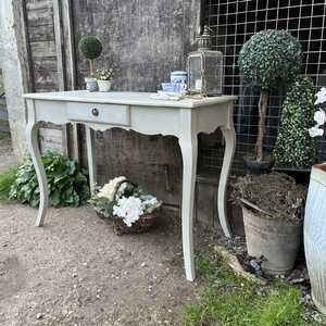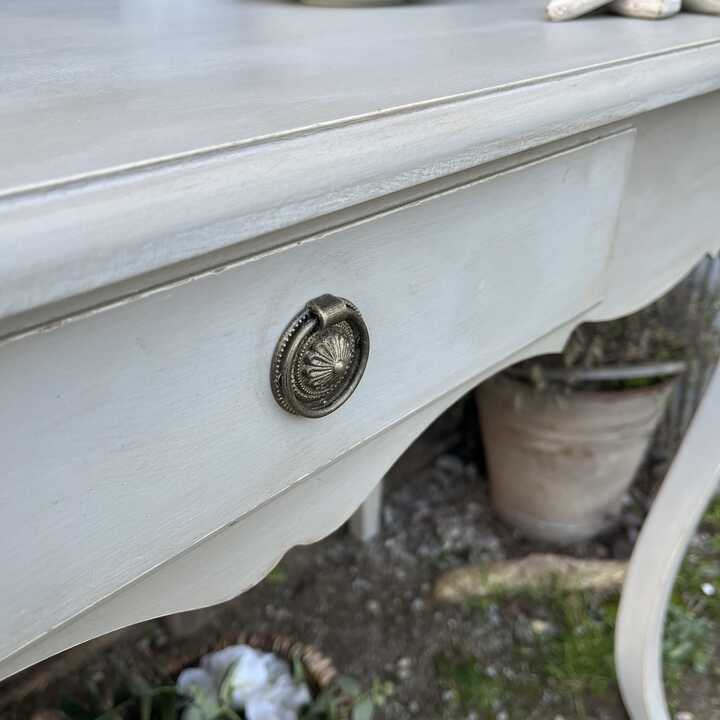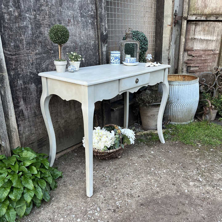 With its beautiful cabriole legs and pretty profiling of the sides of this lovely console table, it has that irresistible charm and character of the French brocante. It has one drawer with an ornate drop handle. It is both large enough to be used as a comfortable desk / dressing table and narrow enough to function as a console table in your hallway etc or if you live small, why not use it as a temporary dining table.