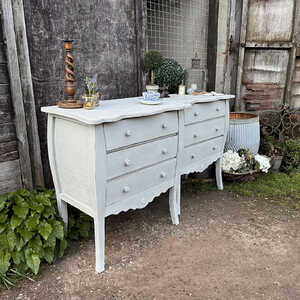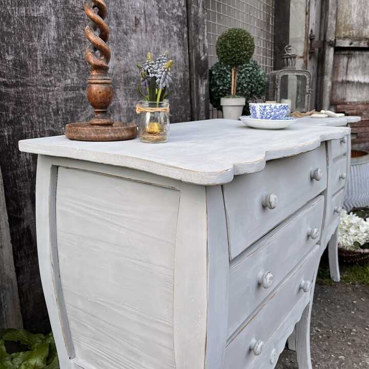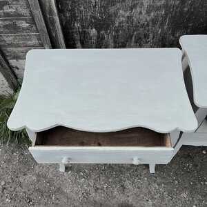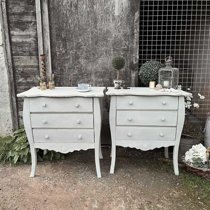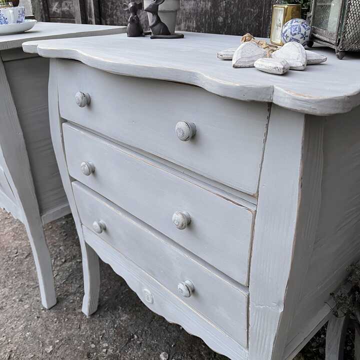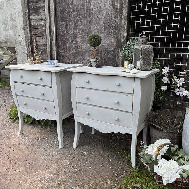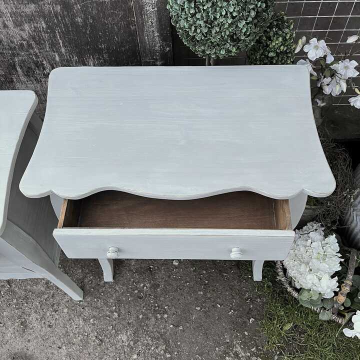 This gorgeous pair of pretty bedside tables has been hand painted in Annie Sloan's Paris Grey. Using our artisan ageing technique, we have slightly distressed them, enhancing the charm and character of the pair.