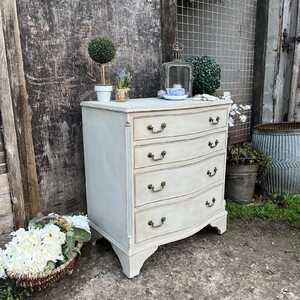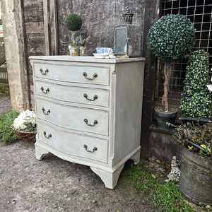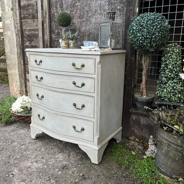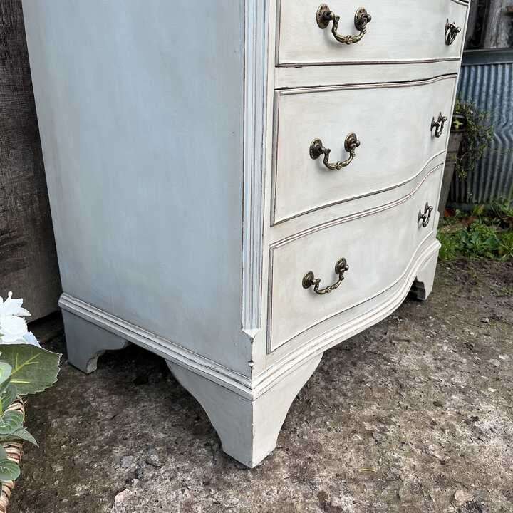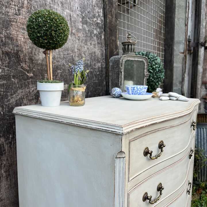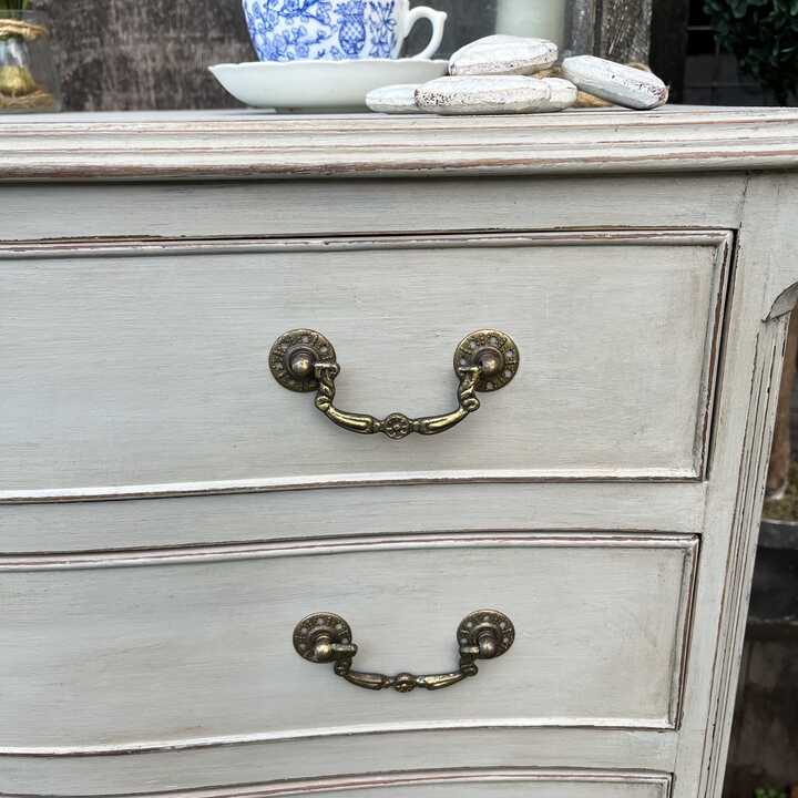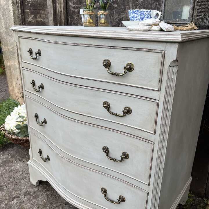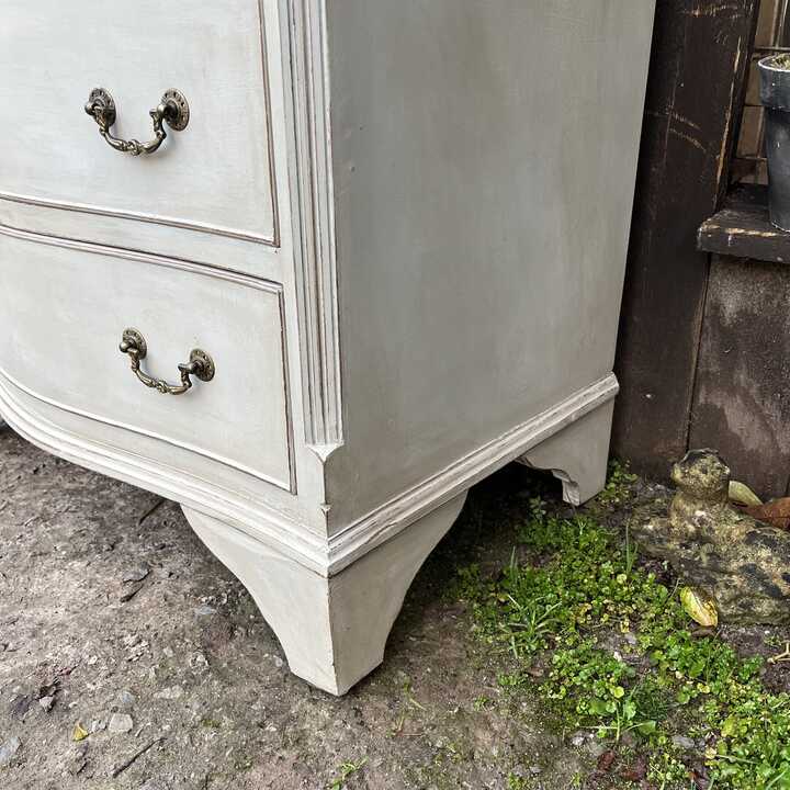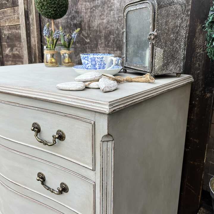 This pretty chest of drawers has been hand painted in Annie Sloan's Paris Grey. Using our artisan ageing technique, we have aged distressed it - enhancing the beautiful shape of this piece.