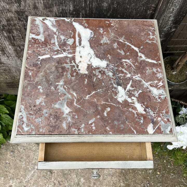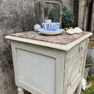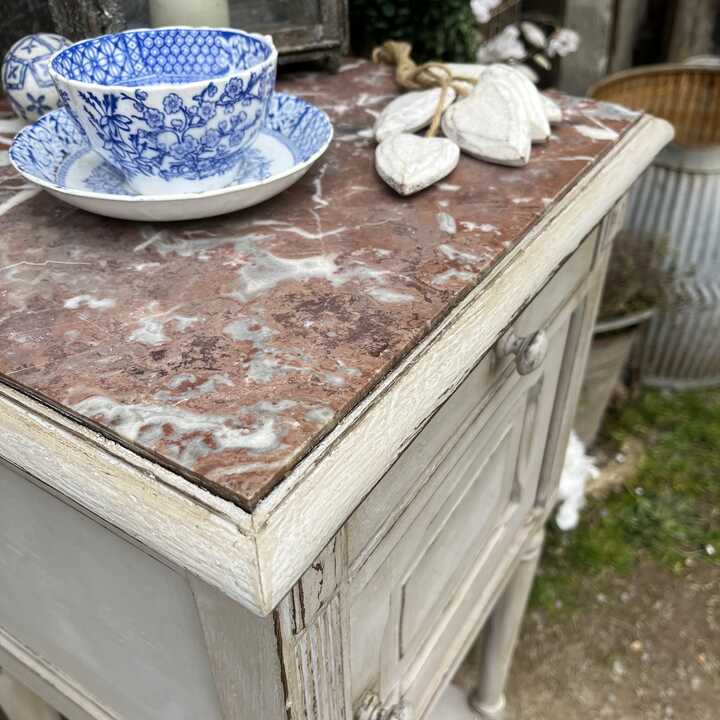 With its French Antique Vintage character, this genuine French pot cupboard with a marble top, will look stunning in your bedroom / guest room. It has one drawer above a pot cupboard that is lined with white porcelain. It also have a handy bottom shelf. Use it as a bedside table, a hall table or a side table.