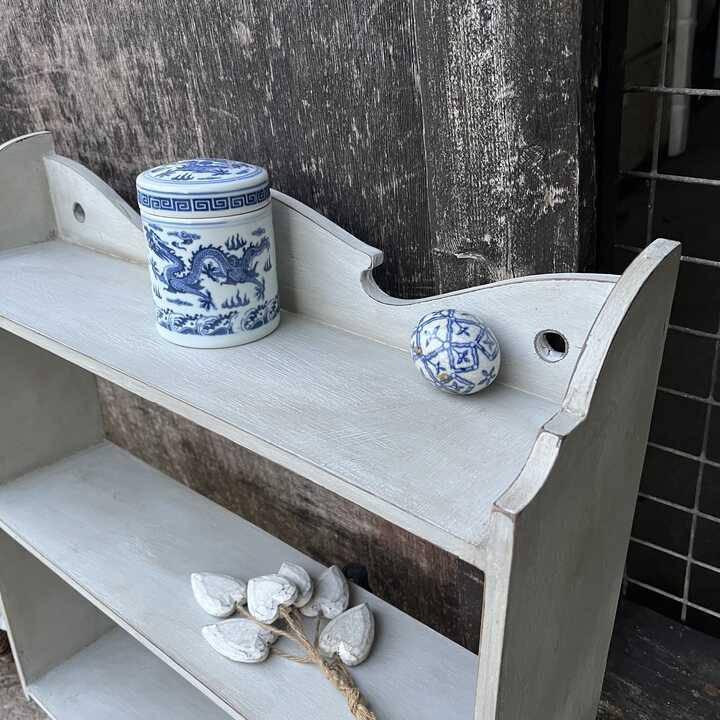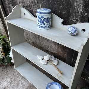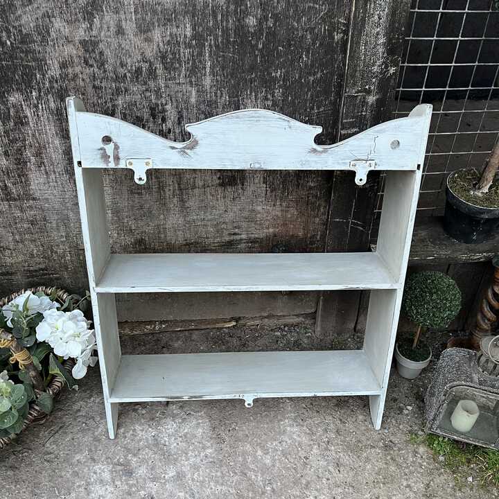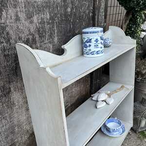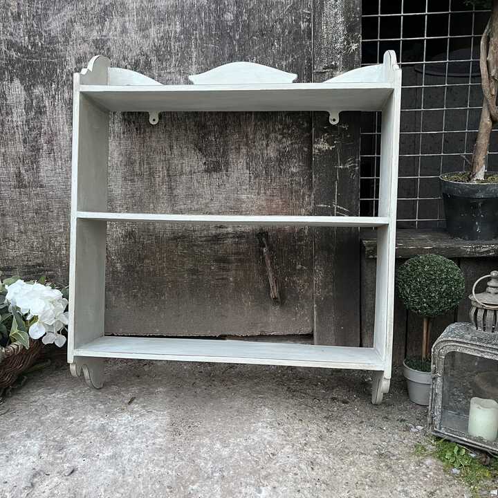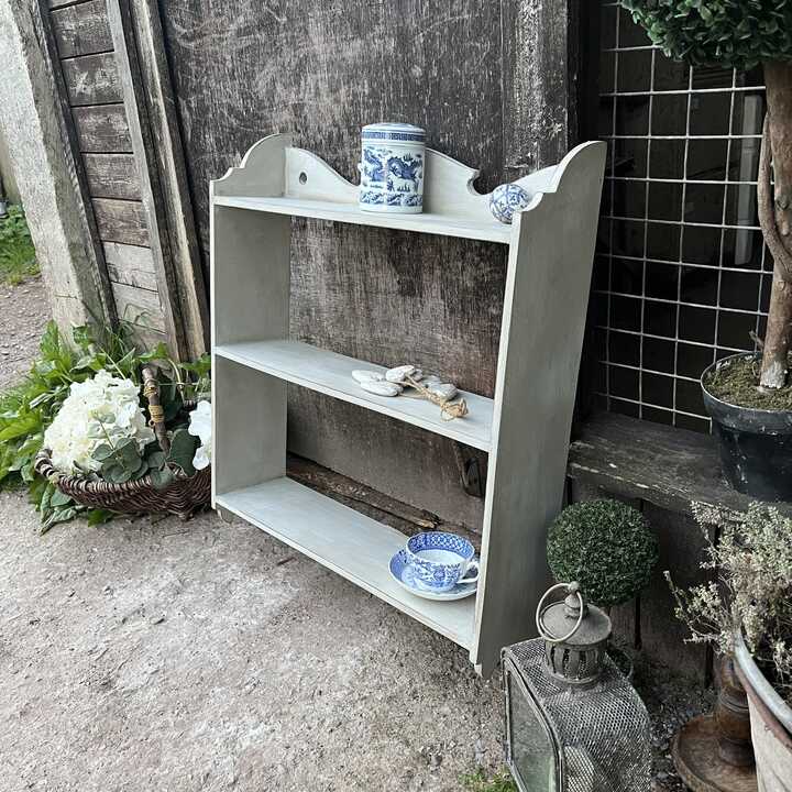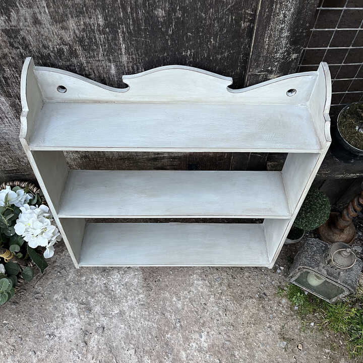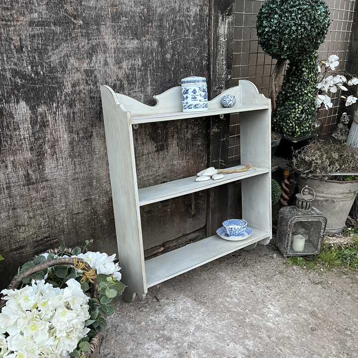 A wall shelf unit like this adds a lovely Country charm to your home. It has been painted in a rustic vintage style. There are three shelves over a decorative rim at the bottom part. Three brackets attached to the shelves makes hanging easy.