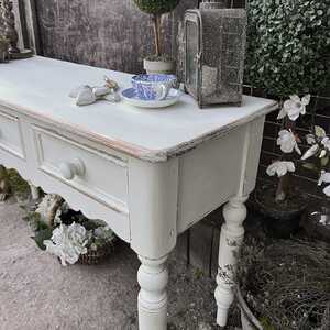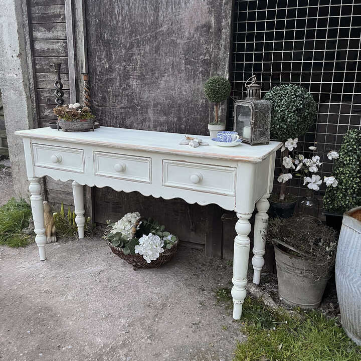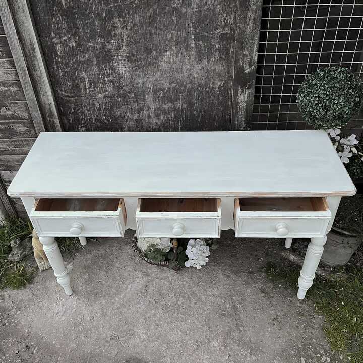 This hand made rustic pine console table has been hand painted in Annie Sloan's Old White. It was painted in cream before, which comes through in places where we have aged distressed it.