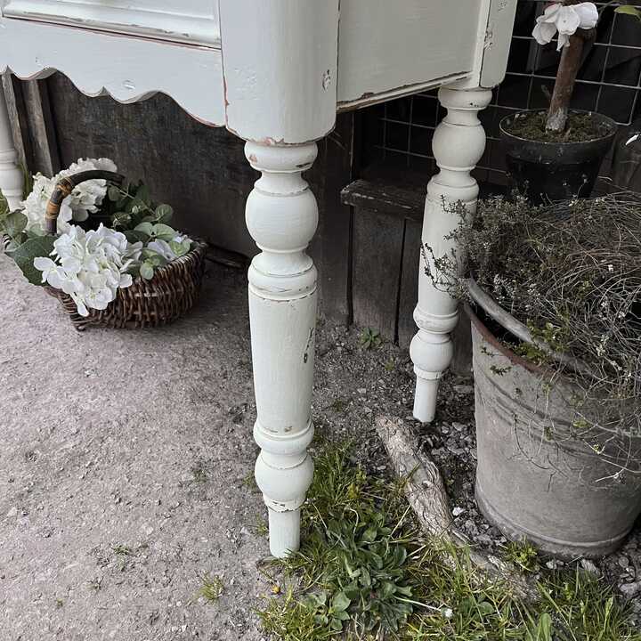 This is a chunky yet romantic piece with its pretty rims and details. It was most likely made in the 2000s and it stands proud on turned legs. With its narrow depth of 44 cm, it is perfect if you are looking for something large, but is less deep.