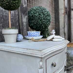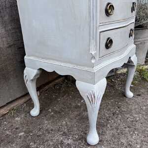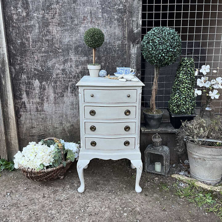 With its charming bow fronted French Country style details, 4 drawers with lovely handles and the added character with the cabriole legs, this piece would look lovely in many areas of your home. Use it as a bedside table, a hall table or as a side table in your living room.