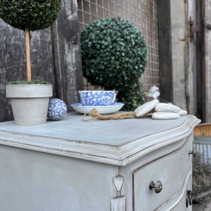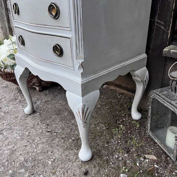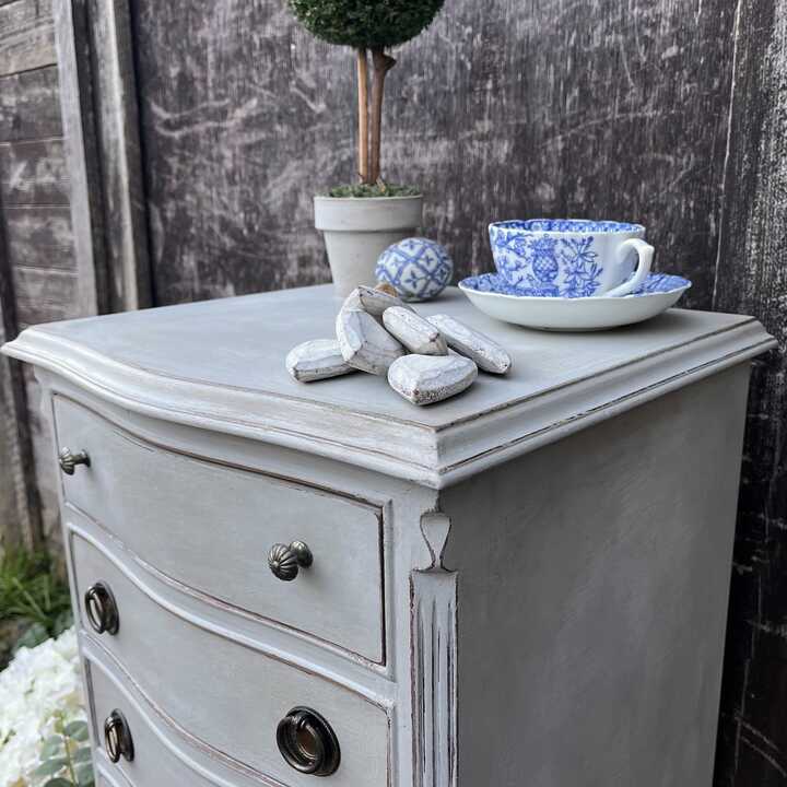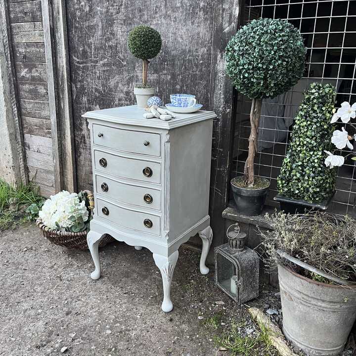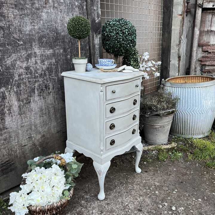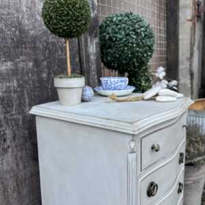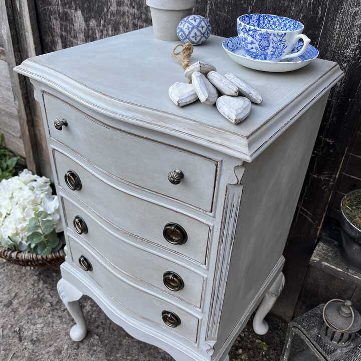 Grey Hand Painted French Country Style Vintage Four Drawer Bow Fronted Bedside Table
