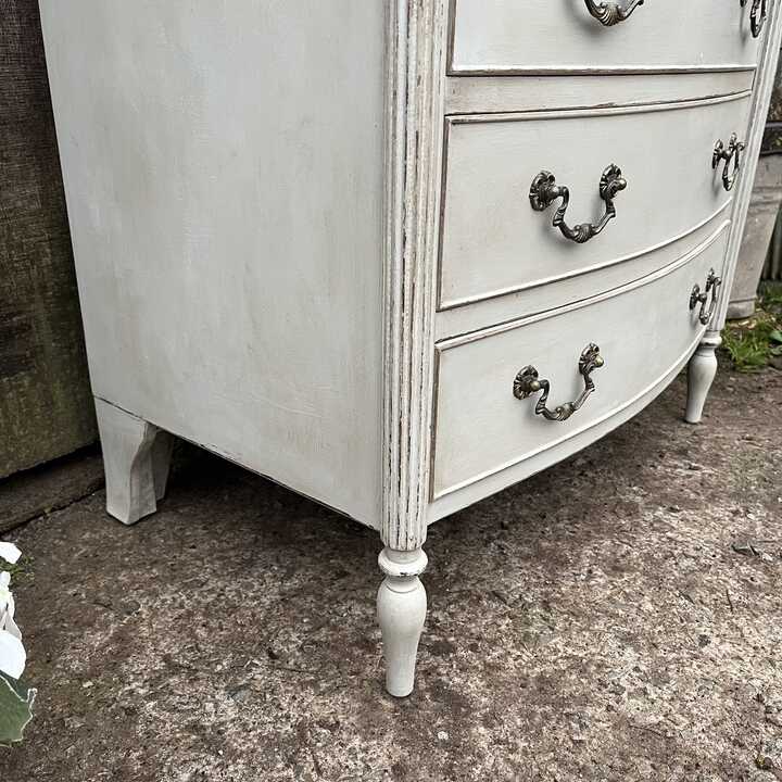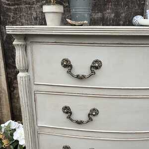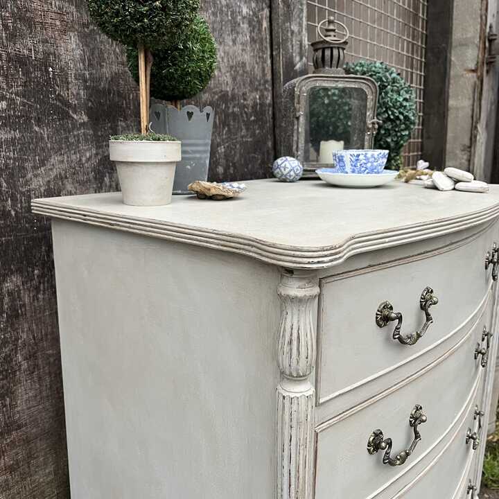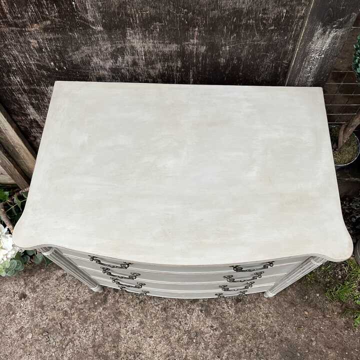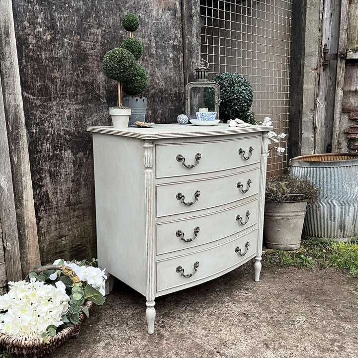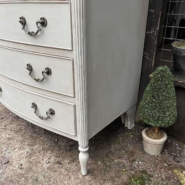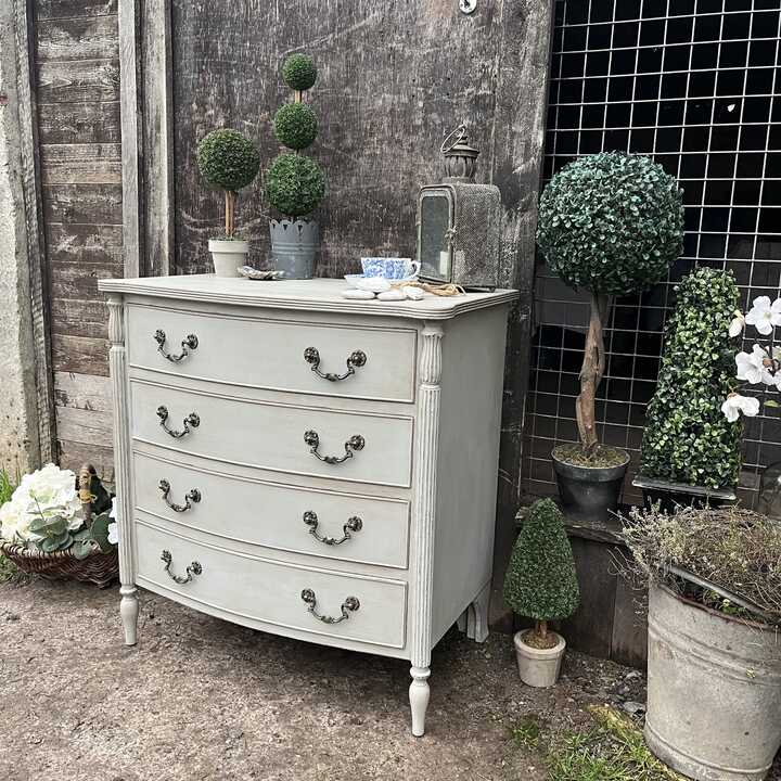 Grey Hand Painted Vintage French Country Style Bow Fronted Four Drawer Chest of Drawers / Bedside Table