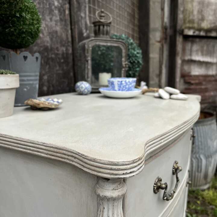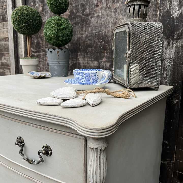 This solid vintage chest of drawers has been hand painted in Annie Sloan's Paris Grey. Using our artisan ageing technique, we have aged distressed it - enhancing the beautiful details of this piece.