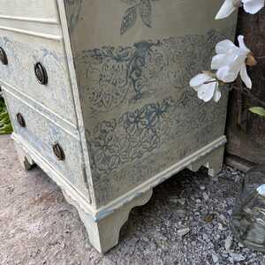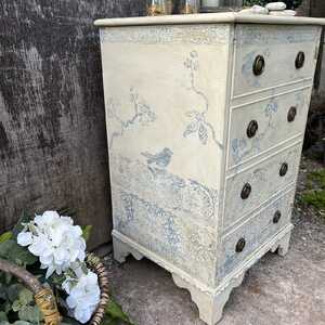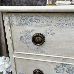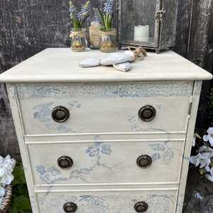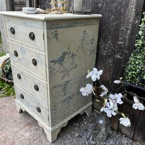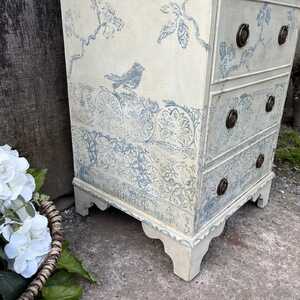 Unique Rustic Cream Hand Painted Vintage Faux Chest of Drawers Cabinet With Blue Folklore / Chinoiseries Stencil