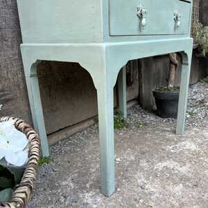This elegant bedside table has been hand painted in Annie Sloan's Duck Egg Blue. Using our artisan ageing technique, we have just slightly aged distressed it, enhancing its beautiful shape and charm.