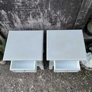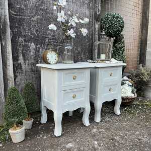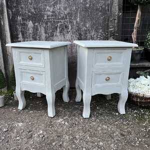 Each piece has two drawers with ornate gold drop handles. Perfect pair if you are looking from some smaller bedside tables. They have a lovely mix of rustic chic and country style and were most likely made in the mid / late 2010s.