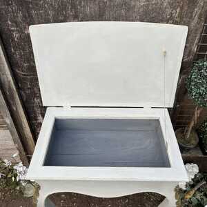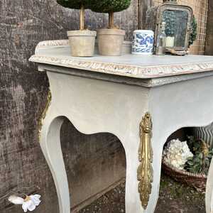 If you are looking for an unique piece of vintage French Chic furniture, then this ornate console table might be just right. It has beautiful brass details on the slender cabriole legs and rim under the table lid. Lift the lid and you will find the perfect space for items that you would like to hide away. The lid has lovely carvings on the edges. The table came with a "homemade" chain to stop the lid going too far back. We have let it stay on, but is easy to remove.