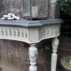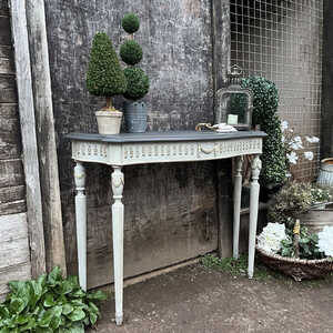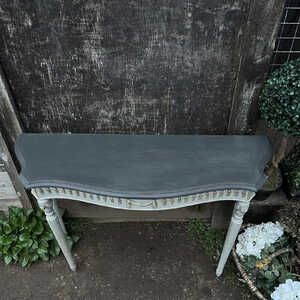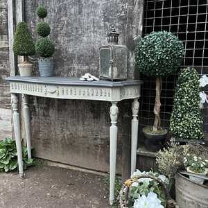 This elegant console table has been hand painted in Annie Sloan's Paris Grey, while the top has been painted in Graphite, which is a black colour with hints of dark blue and grey. Using our artisan ageing technique - it has been aged distressed, enhancing the charm and character of this piece.