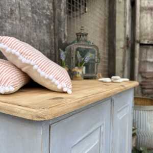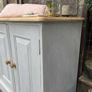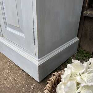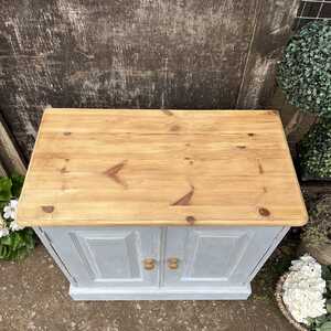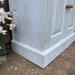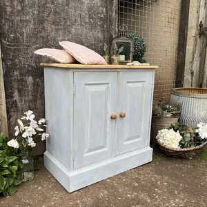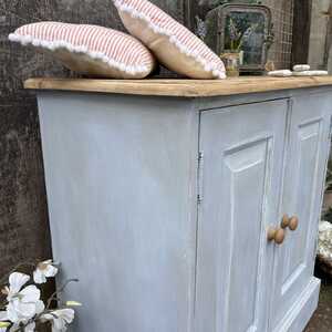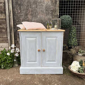 This pine cabinet has been hand painted in Annie Sloan's Louis Blue. Using our artisan ageing technique, we have aged it, enhancing the rustic character of the piece. The top has been sanded, creating a beautiful contrast to the painted base.
