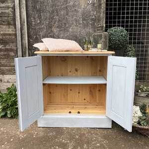 With its Country Farmhouse charm and relatively small size, this rustic pine cupboard / cabinet will look lovely in many areas of your home. It has lots of storage space and a removable shelf behind two shaker styled doors. Perfect as a storage unit in your hallway, kitchen, dining room etc. or why not add a rustic touch to your bathroom and use it as a basin base.