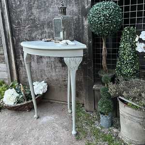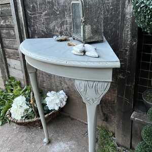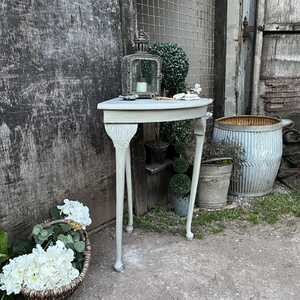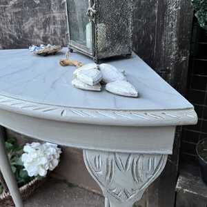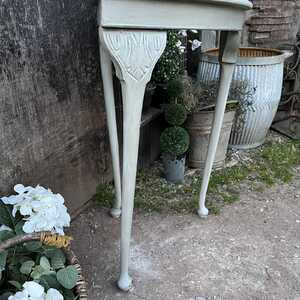 The base of this lovely corner table has been hand painted in Annie Sloan's Paris Grey - using our artisan ageing technique - it has been aged distressed enhancing the beautiful shape and details of this table. We decided to paint the table top in a marble effect. Should you not like it, then we are happy to paint over it.