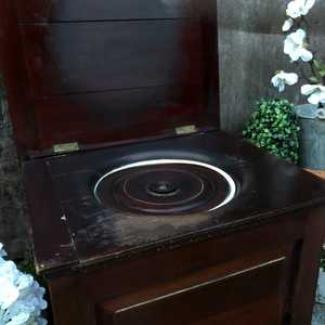 It has its original white ceramic bowl and mahogany lid. It looks like the date "6/6/07" has been written inside the commode - see photo.