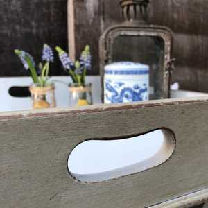 This beautiful mahogany butler's tray side table has lots of character and charm. The exterior has been hand painted in Fusion Mineral Paint's Little Lamb, waxed and - using our artisan ageing technique - it has been aged distressed enhancing the rustic charm and character of the piece. The interior of the tray has been painted in a contrasting white colour - creating a crisp, fresh contrast to the aged grey exterior.