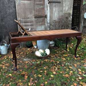 It stands proud on elegant cabriole legs. The top has a darker colour than the base/bed, so has probably been added later - we do not know. The webbing in the bed is strong, but the fabric has a few holes in it (probably made recently by people trying to figure out how it operates). Please not that we are selling it as a side table with the history of being a Doctor's bed - not as an actual bed.