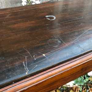 It is in a generally good antique condition. As you can see from the photos there are marks, dents etc on both the base and the removable top. The top slots in well but is a little bit warped on one side (we are pointing this out if you are going to use it as a double desk). We are happy to send you more photos if you so wish.