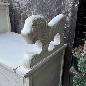 This rather unique piece will add some fun to your hallway, bedroom etc. We love the hand carved lion armrest, which really makes this hall seat stand out from the rest. It is most likely originally from South East Asia. It is sturdy and has a large storage space under the seat.The table section has a cupboard space over two drawers.