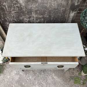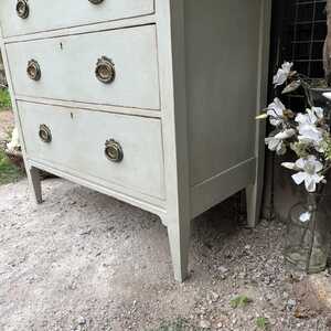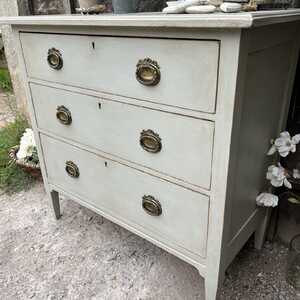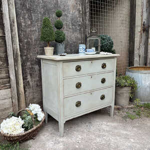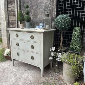 This chest of drawers has a rustic Swedish Gustavian Country style charm. It has got that lovely combination of elegance and rustic, which makes it utterly adorable. It stands proud on raised feet, has three spacious drawers with romantic, ornate oval drop handles. with its sleek lines, this little gem would look just as perfect in a period property, as in a contemporary home. This piece is perfect as a chest of drawers / bedside table in your bedroom or as a storage side table in your living room / hallway. It is probably from the 1950s and we think it is made of yew wood or something similar.