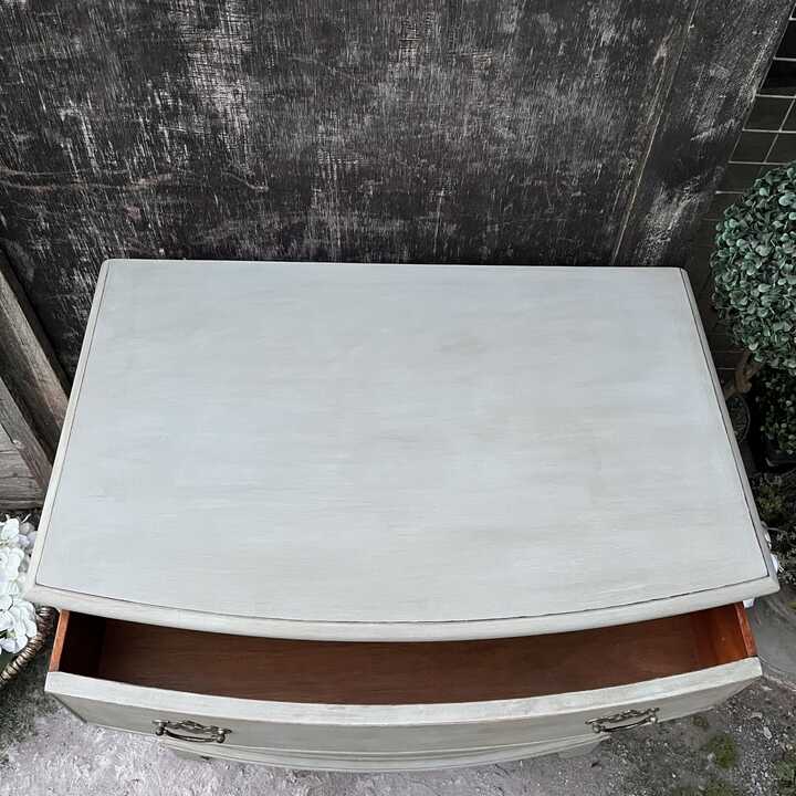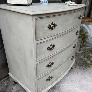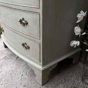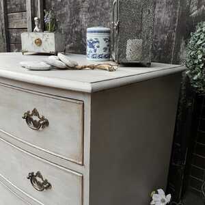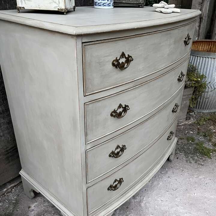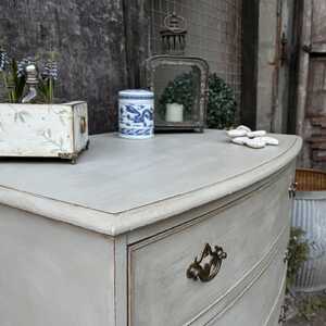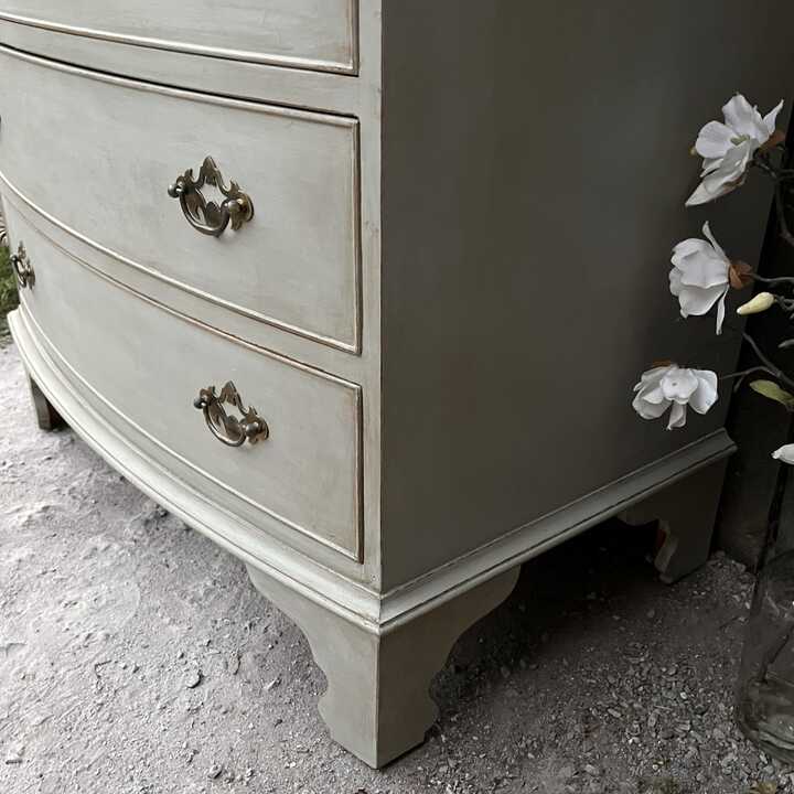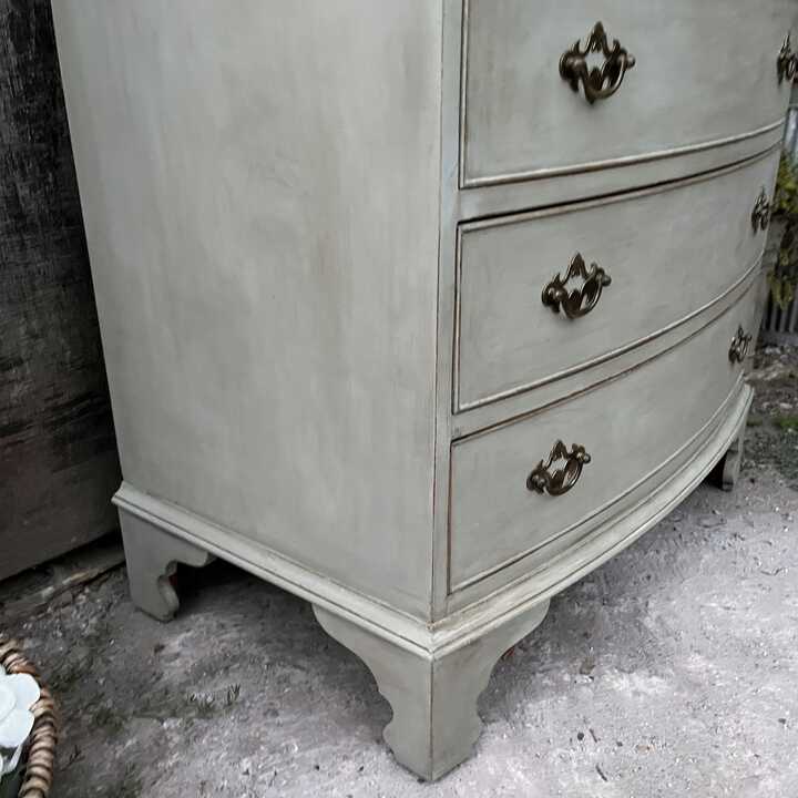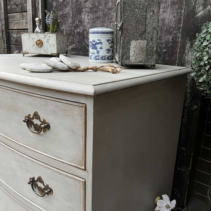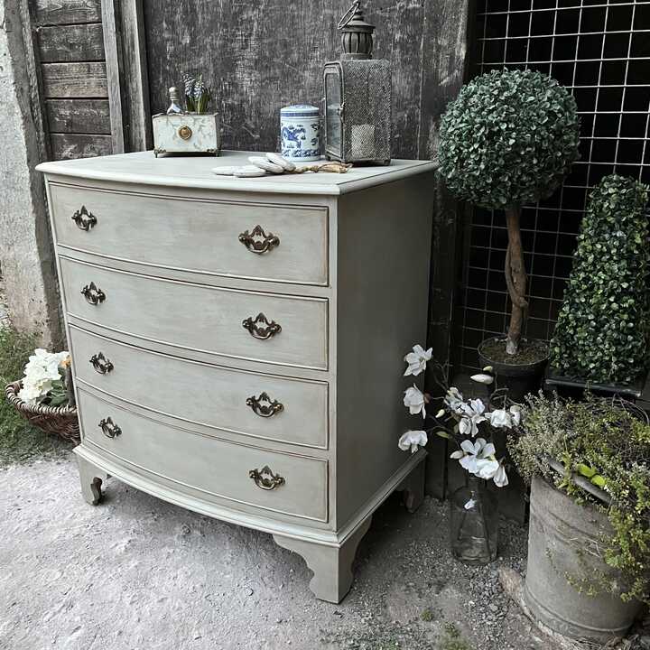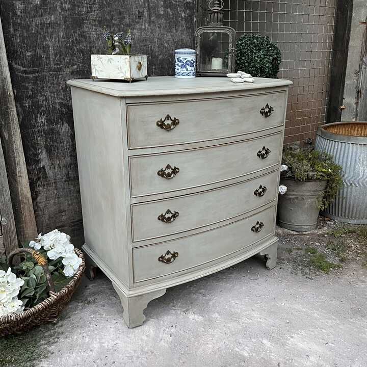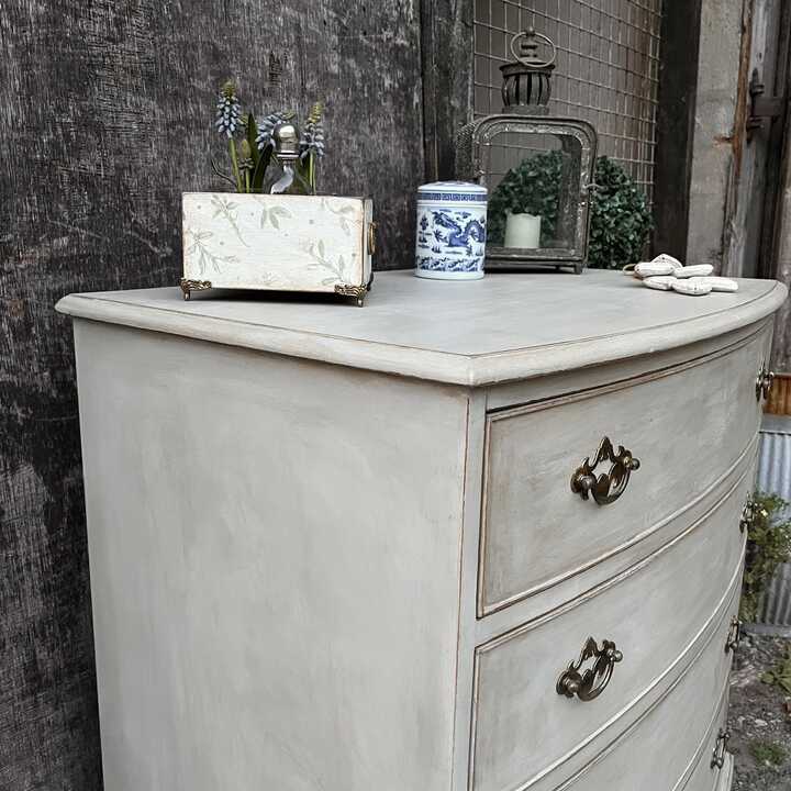 This vintage bow fronted chest of drawers has been hand painted in Annie Sloan's Paris Grey. Using our artisan ageing technique, we have aged distressed it - enhancing the style and character of this piece.