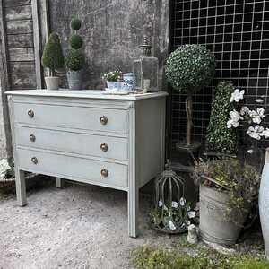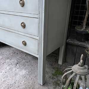 This beautiful chest of drawers has been hand painted in Annie Sloan's Paris Grey. Using our artisan ageing technique, we have aged distressed it - enhancing the decorative details of this piece.