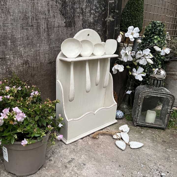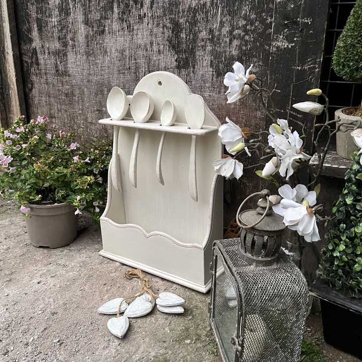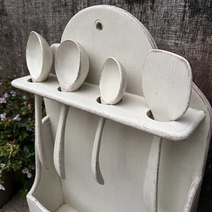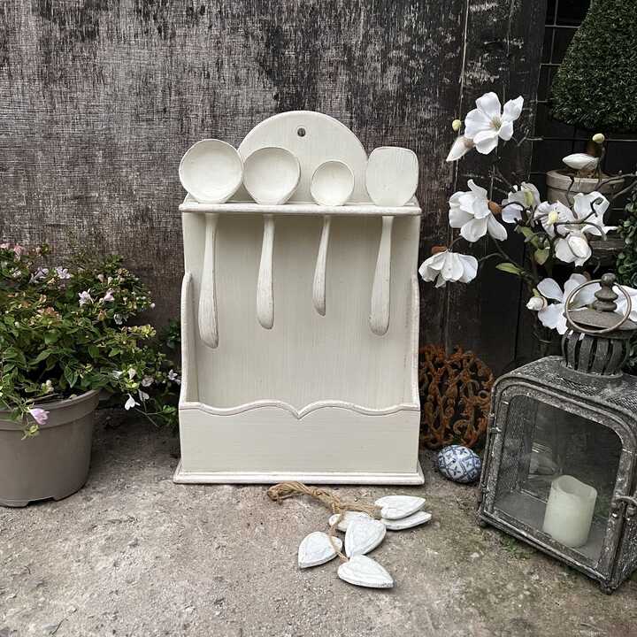 This charming rustic wall unit will add Country charm and character to your kitchen. Perfect for storing recepies, letters etc. The spoons are for decoration purposes only. Please replace them with your own spoons for cooking.
