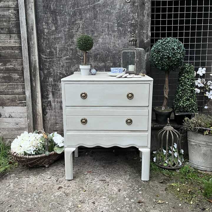 We just love the “less is more” simplicity of this little chest of drawers. It was most likely made in the 1930s and it has a charming mix of Art Deco, and strangely enough, the sleek lines of the Swedish Gustavian Country style. With its sleek lines, it will fit in a contemporary home just as well as in a period property. It has two spacious drawers with ornate round drop handles. The scallop rim is a pretty detail. This piece is perfect as a chest of drawers / bedside table in your bedroom or as a storage side table in your living room / hallway.
