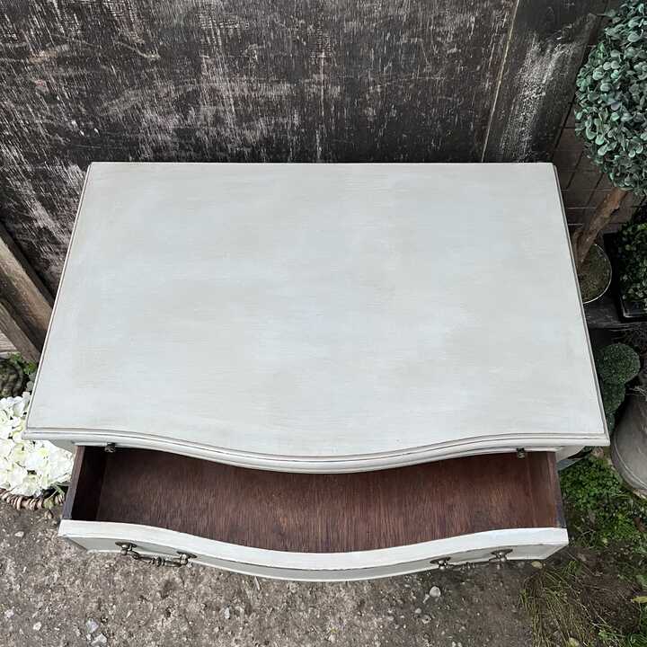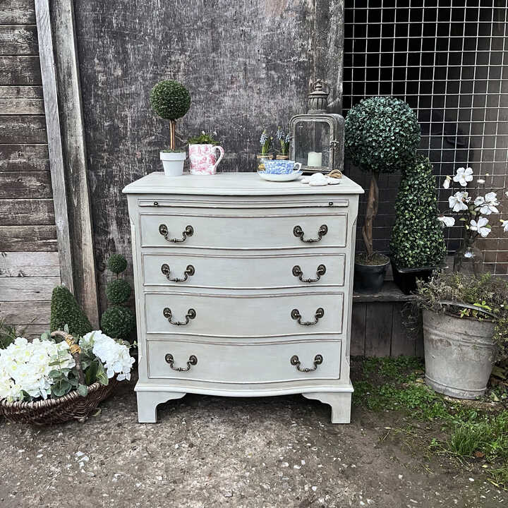 With its classic style, this serpentine fronted chest of drawers offers a distressed yet elegant patina. It has a handy pull out pad, perfect for a smaller space as it can double as a desk. It has four spacious drawers with the original ornate handles, which have been given a touch of gold. This multi-functional piece is perfect as a chest of drawers / bedside table / desk in your bedroom or as a storage side table in your living room / hallway. It is probably from the 1980/90s.