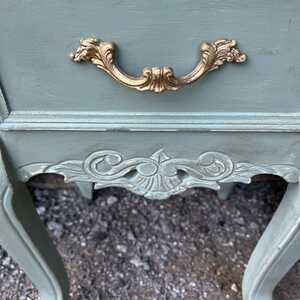 This gorgeous French Country style bedside table has been hand painted in Annie Sloan's Duck Egg Blue. Using our artisan ageing technique, we have aged distressed it, adding character and charm to the piece. We are not quite sure of the age of this piece, it is probably mid/late 2010s.