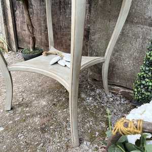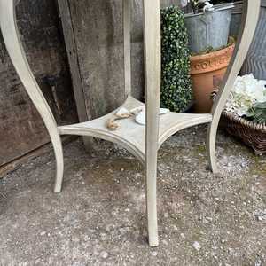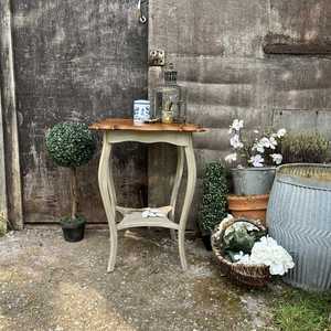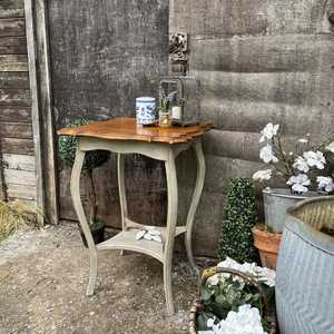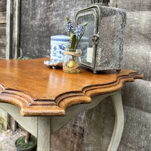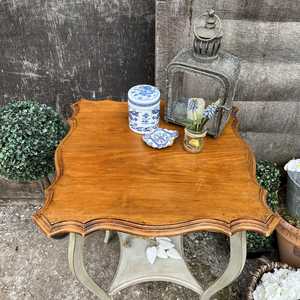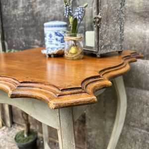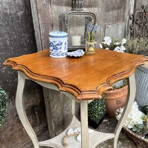 The base of this gorgeous mahogany side table has been hand painted in Annie Sloan's Paris Grey, waxed and - using our artisan ageing technique - it has been aged distressed, while leaving the ornate top unpainted - exposing the beautiful mahogany wood.