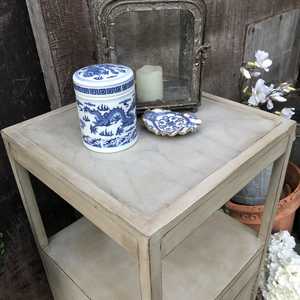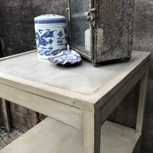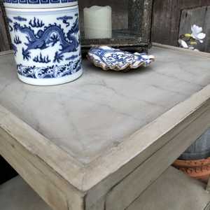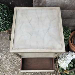 There are many ways to use this pot cupboard in your house. It has one drawer, a cupboard and a useful shelf for books, towels etc. The handles have been given a touch of gold - creating a beautiful contrast to the aged finish. As the shape is rather square, we have added a faux marble effect on the table top.